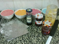 El naranja era de lemon curd y buttercream de naranja, el rosa de fresa, el rojo de chocolate blanco y frambuesa y el azul de vainilla y arándanos.